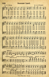 Author: Mrs. M. B. C. L. Slade Hymnal: New Christian Hymn and Tune Book #695 (1882) First Line: Beyond this land of parting, losing and Topics: Heaven Languages: English Tune Title: SUMMER-LAND