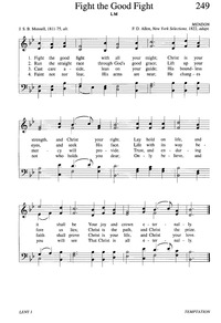 Author: J. S. B. Monsell, 1811-75 Hymnal: Evangelical Lutheran Hymnary #249 (1996) Meter: 8.8.8.8 First Line: Fight the good fight with all your might Lyrics: 1 Fight the good fight with all your might; Christ is your strength and Christ your right. Lay hold on life, and it shall be Your joy and crown eternally. 2 Run the straight race through God's good grace; Lift up your eyes, and seek His face. Life with its way before us lies; Christ is the path and Christ the prize. 3 Cast care aside, lean on your guide; His boundless mercy will provide. Trust, and enduring faith shall prove Christ is your life, and Christ your love. 4 Faint not nor fear, His arms are near; He changes not, who holds you dear; Only believe, and you will see That Christ is all eternally. Topics: Lent 1 Languages: English Tune Title: MENDON