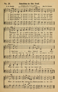 Author: E. E. HewittHymnal: Jubilant Praise #19 (1909)First Line: There's sunshine in my soul todayRefrain First Line: O there's sunshine, blessed sunshineLanguages: EnglishTune Title: [There's sunshine in my soul today]