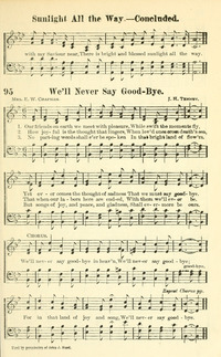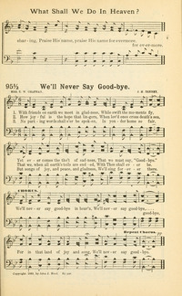 Author: Mrs. E. W. ChapmanHymnal: Lasting Hymns #95.5 (1901)First Line: With friends on earth we meet in gladnessRefrain First Line: We'll never say goodby in heav'nLanguages: EnglishTune Title: [With friends on earth we meet in gladness]