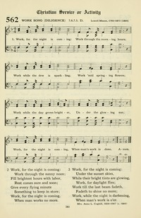 Author: Annie Walker Coghill Hymnal: Psalms, Hymns, and Spiritual Songs #592 (2012) Meter: 7.6.7.5 D First Line: Work, for the night is coming Languages: English Tune Title: WORK SONG