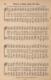 Hymnal: GCCS1888 #92 (1888)First Line: There's a shout along the temp'rance linesRefrain First Line: There's a shout, there's victory in viewLanguages: EnglishTune Title: [There's a shout along the temp'rance lines]