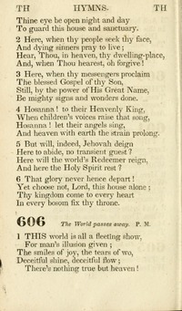 Author: Thomas Moore Hymnal: A Selection of Hymns, adapted to the devotions of the closet, the family, and the social circle; and containing subjects appropriate to the monthly concerns of prayer for the success... #606 (1831) Languages: English
