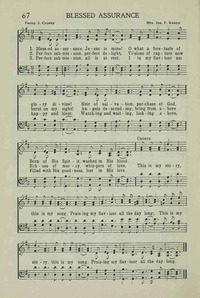 Author: Fanny J. CrosbyHymnal: Hymns for the Family of God #67 (1976)First Line: Blessed assuarance, Jesus is mine!Refrain First Line: This si my story, this is my songTopics: Assurance; AssuranceLanguages: EnglishTune Title: ASSURANCE