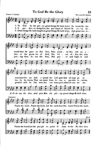 Author: Fanny J. CrosbyHymnal: Songs of the Church #27 (1990)First Line: To God be the glory, great things He hath doneTune Title: [To God be the glory, great things He hath done]