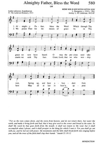 Author: Unknown Hymnal: Evangelical Lutheran Hymnary #580 (1996) Meter: 8.8.8.8 Lyrics: 1 Almighty Father, bless the Word Which through Thy grace we now have heard. O may the precious seed take root, Spring up, and bear abundant fruit. 2 We praise Thee for the means of grace As in Thy courts we seek Thy face. Grant, Lord, that we who worship here May all at last in heav'n appear. Topics: Benediction Scripture: Isaiah 55:10-12 Languages: English Tune Title: WENN WIR IN HÖCHSTEN NÖTEN SEIN