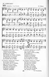 Author: G. Calamita Hymnal: Cantos Espirituales #58 (1969) First Line: ¡Luchad, luchad por Cristo Lyrics: 1 ¡Luchad, luchad por Cristo,Soldados de la cruz!¡Alzad triunfal bandera,Enhiesta por Jesús!De triunfo en triunfo siempre,Sed guardas de su honor,Y haced que el enemigoSe humille ante el Señor.2 ¡Luchad, luchad por Cristo!,La trompa obedeced;No huyáis ante el combate,Que es hora de vencer.¡Soldados, siempre firmes,Con mil, uno, luchad;Y bravos, el peligro,Valientes, rechazad.3 ¡Luchad, luchad por Cristo!,En su poder fiad;Que vuestro brazo es débil,Y desfallecerá.Vestíos la armadura,Velando en oración,Y do el peligro os llame,No os faltare, no, el valor.4. ¡Luchad, luchad por Cristo!,La lid va a comenzar,Al ruido del combate,El triunfo seguirá.Corona el esforzado,De vida y luz tendrá.Y con el Rey de gloria,Por siempre reinará. Languages: Spanish Tune Title: [¡Luchad, luchad por Cristo]