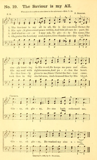 Author: P. B. Hymnal: Hymns New and Old #19 (1887) First Line: The Saviour is my all in all Refrain First Line: Glory! oh, glory Languages: English Tune Title: [The Saviour is my all in all]