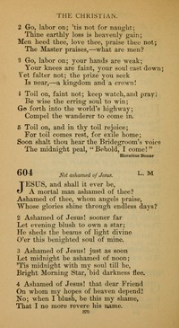 Author: Rev. Isaac Watts (1674-1748) Hymnal: Many Voices; or, Carmina Sanctorum, Evangelistic Edition with Tunes #313 (1891) Topics: Ashamed of Jesus First Line: I'm not ashamed to own my Lord Scripture: 2 Timothy 1:12 Languages: English