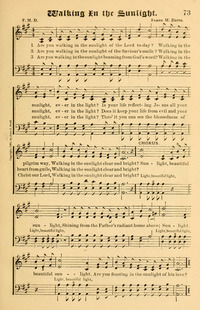 1839 - 1896 Person Name: F. M. D. Author of "Walking in the Sunlight" in Praise and Rejoicing Frank Marion Davis USA 1839-1896. Born at Marcellus, NY, he became a teacher and professor of voice, a choirmaster and a good singer. He traveled extensively, living in Marcellus, NY, Vicksburg, MS, Baltimore, MD, Cincinnati, OH, Burr Oak and Findley, MI. He compiled and published several song books: “New Pearls of Song” (1877), “Notes of Praise” (1890), “Crown of gold” (1892), “Always welcome” (1881), “Songs of love and praise #5” (1898), “Notes of praise”, and “Brightest glory”. He never married.