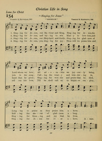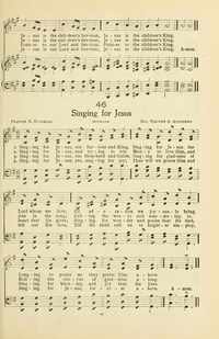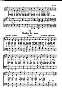 Author: Frances R. Havergal Hymnal: Lutherförbundets Sångbok #E160 (1913) Meter: 10.10.10.10 Lyrics: 1 Singing for Jesus, our Saviour and King; Singing for Jesus, the Lord, whom we love; All adoration we joyously bring, Longing to praise as they praise Him above. 2 Singing for Jesus, and trying to win Many to love Him, and join in the song; Calling the weary and wandering in, Rolling the chorus of gladness along. 3 Singing for Jesus, our Shepherd and Guide; Singing for gladness of heart that He gives; Singing for wonder and praise that He died, Singing for blessing and joy that He lives. 4 Singing for Jesus--yes, singing for joy; Thus will we praise Him and tell out His love, Till He shall call us to brighter employ, Singing for Jesus, forever above. Topics: Prayer and Praise Languages: English Tune Title: BROMHAM