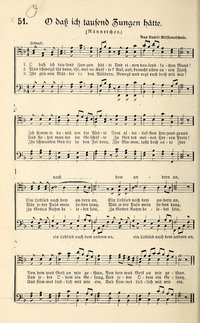 0 dass ich tausend Zungen hatte. Praise and Thanksgiving. His best hymn. First published as No. 496, in Freylinghausen's Gesang-Buch, 1704, in 15 st. of 6 1., and repeated in many later collections as the Unverfälschter Liedersegen, 1851, No. 719.