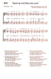 Author: James Montgomery Hymnal: Hymns to the Living God #27 (2017) Meter: 6.6.8.6 Lyrics: 1 Stand up, and bless the Lord,