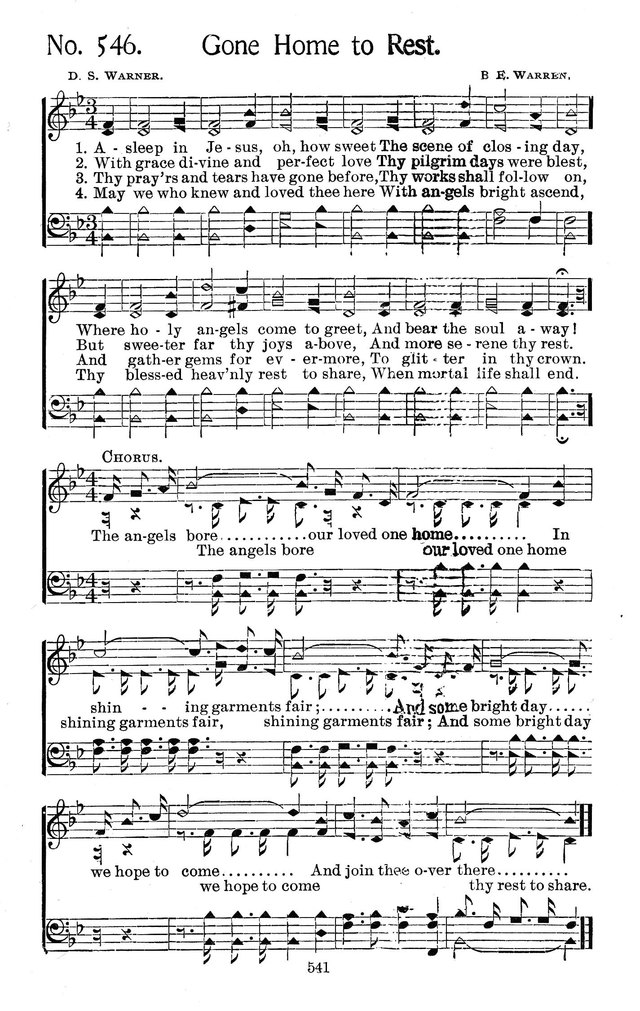 Display Title: Gone Home to RestFirst Line: Asleep in Jesus, oh, how sweetTune Title: [Asleep in Jesus, oh, how sweet]Author: Daniel S. WarnerMeter: 8.6.8.6 DScripture: 1 Thessalonians 4:13-18Source: Faith Publishing House, Echoes from Heaven, 1976 (101); The Gospel Trumpet Company, Select Hymns, 1911 (546); Timeless Truths (http://library.timelesstruths.org/music/Gone_Home_to_Rest)