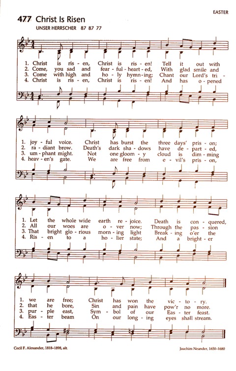 As a small girl, Cecil Frances Humphries (b. Redcross, County Wicklow, Ireland, 1818; Londonderry, Ireland, 1895) wrote poetry in her school's journal. In 1850 she married Rev. William Alexander, who later became the Anglican primate (chief bishop) of Ireland. She showed her concern for disadvantaged people by traveling many miles each day to visit the sick and the poor, providing food, warm clothes, and medical supplies. She and her sister also founded a school for the deaf. Alexander was strongly influenced by the Oxford Movement and by John Keble's Christian Year. Her first book of poetry, Verses for Seasons, was a "Christian Year" for children. She wrote hymns based on the Apostles' Creed, baptism, the Lord's Supper, the Ten Commandment… Go to person page >| First Line: | He is risen, He is risen; Tell it out with joyful voice |