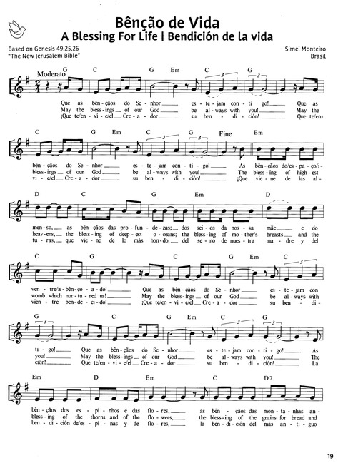 Display Title: Bênção de Vida (A Blessing for Life) First Line: Que as bênçãos do Senhor (May the blessings of God) Tune Title: [Que as bênçãos do Senhor] Author: Simei Monteiro Scripture: Genesis 49:25-26 Date: 2021 Source: "The New Jerusalem Bible"; Brasil