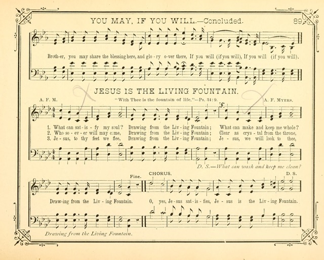Augustus (Gus) Franklin Myers USA 1850-1902. Born at Ashland, OH, he was a music composer and publisher. He may have taught music, as his title of ‘Professor’, is noted by one source. His song books include: “The life line”, “The search light” (1894), “The seed sower” (1897). He wrote many lyrics and tunes. He died at Toledo, OH.