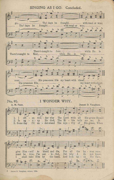 Vaughan, James D(avid); b. Dec. 14, 1864, between Lawrence Co. and Giles Co., TN; d. Feb. 9, 1941, Lawrenceburg, TN; music publisher, composer and compiler of gospel songs in shape notation Go to person page >