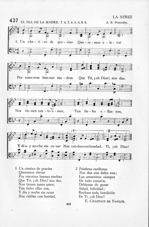 Tune Title: EL DIA DE LA MADRE First Line: Un cántico de gracias Composer: A. B. Ponsonby Meter: 7. 6. 7. 6. 6. 6. 8. 6. Incipit: 17657 65343 453 Key: B♭ Major Date: 1931