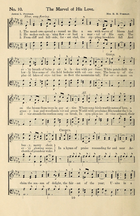 Tune Title: [The meadows spread around us like a sea with waves of bloom] First Line: The meadows spread around us like a sea with waves of bloom Composer: Mrs. R. R. Forman Incipit: 13343 45561 53212 Date: 1911